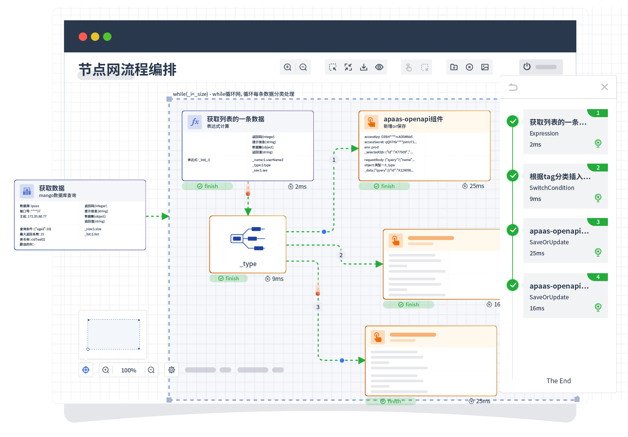 针对集成场景,,组件定义后支持进行流程编制,,,不同于传统代码方式,,通过图形化展示,,,,支持在线调试、、日志查看和运行回放。。。