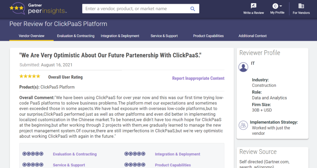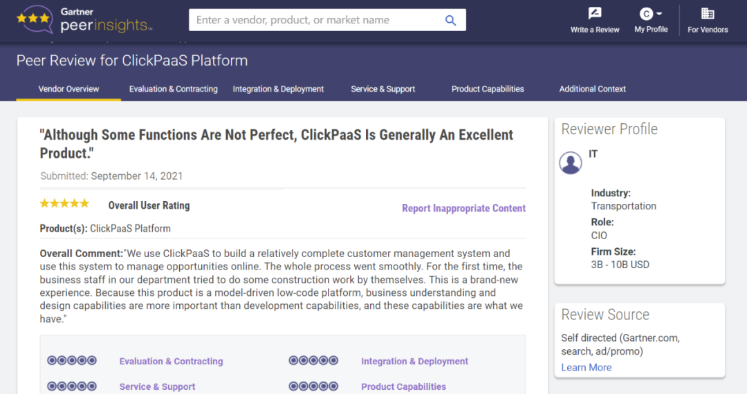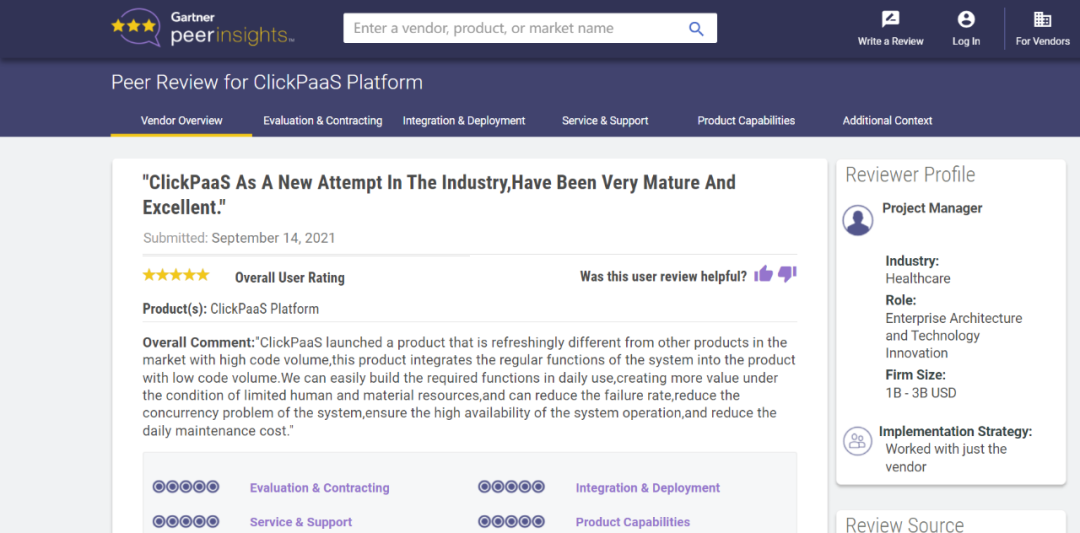 Tips::【Peer Insights】——用户对企业IT产品和服务发布真实评价的平台。。目前已有355个市场,,255,000条经过验证的评价。。每一条评价Gartner会针对参评企业营收规模及参评人员信息做验证、、评价内容做多维核实。。
